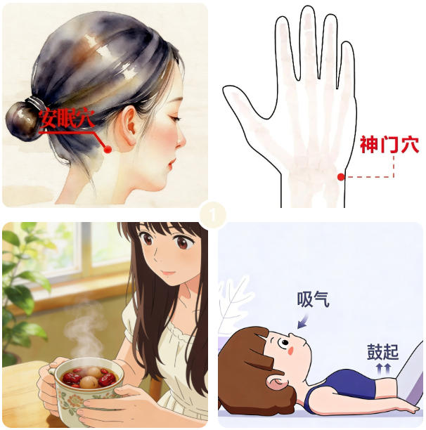 ●穴位按摩:睡前按揉安眠穴(耳后凹陷处)、神门穴(手腕横纹处),各3-5分钟,有助宁心安神。