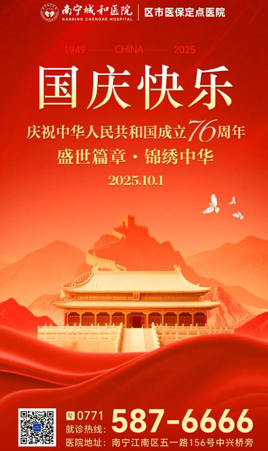 金秋送爽,举国同庆。当大街小巷飘扬着“中国红”,当千家万户洋溢着团圆的欢声笑语,总有一份坚守,在默默守护着这份祥和与安康。在这个属于全体中国人的欢乐假期,南宁城和医院郑重向您承诺:国庆假期,我们全程不“打烊”!我们深知,疾病伤痛从无节假日,健康守护更不能有片刻松懈。因此,我们始终秉持“无假日医院”的服务理念,全体医护人员坚守岗位,为邕城百姓的健康保驾护航。